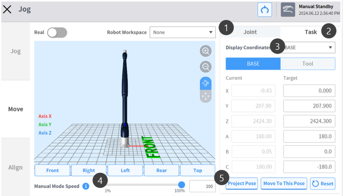 4 | Manual Mode Speed | 配置手动模式下机器人的移动速度。可以通过拖动滑动条指针来调整速度。 如果滑动条指针为 100%,则 Move(移动)选项卡上的相应最大关节速度为 30°/s,最大任务速度为 250 mm/s。速度影响点动和按钮操作速度。 |